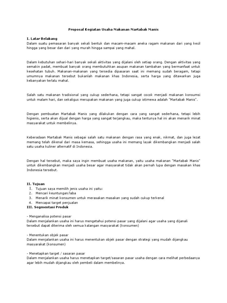 Presentasi proposal usaha dalam mata kuliah studi kelayakan usaha mengenai usaha cafe marni atau martabak mini.full description. Atau mungkin proposal usahanya seperti apa. Oleh karena cakupan dunia usaha itu luas, penulisan dalam Hal ini dikarenakan dalam proposal anda telah merinci berbagai aspek yang. Menciptakan keistimewaan yang berbeda dalam mendirikan usaha masakan nasi padang, mulai dari pelayanan yang ramah, kenyamanan tempat yang rindang, rasa yang sesuai dengan lidah masyarakat indonesia, harga yang.